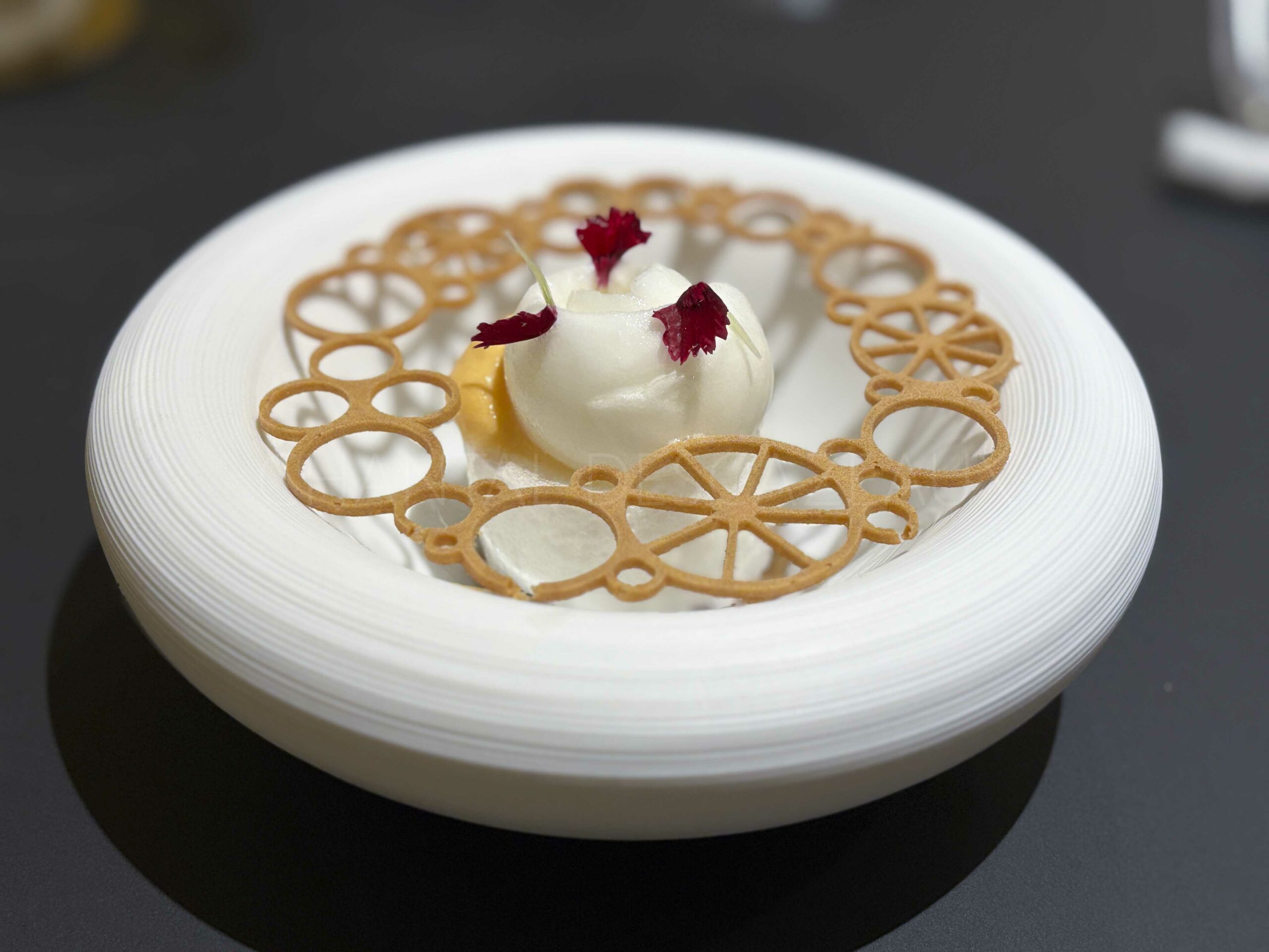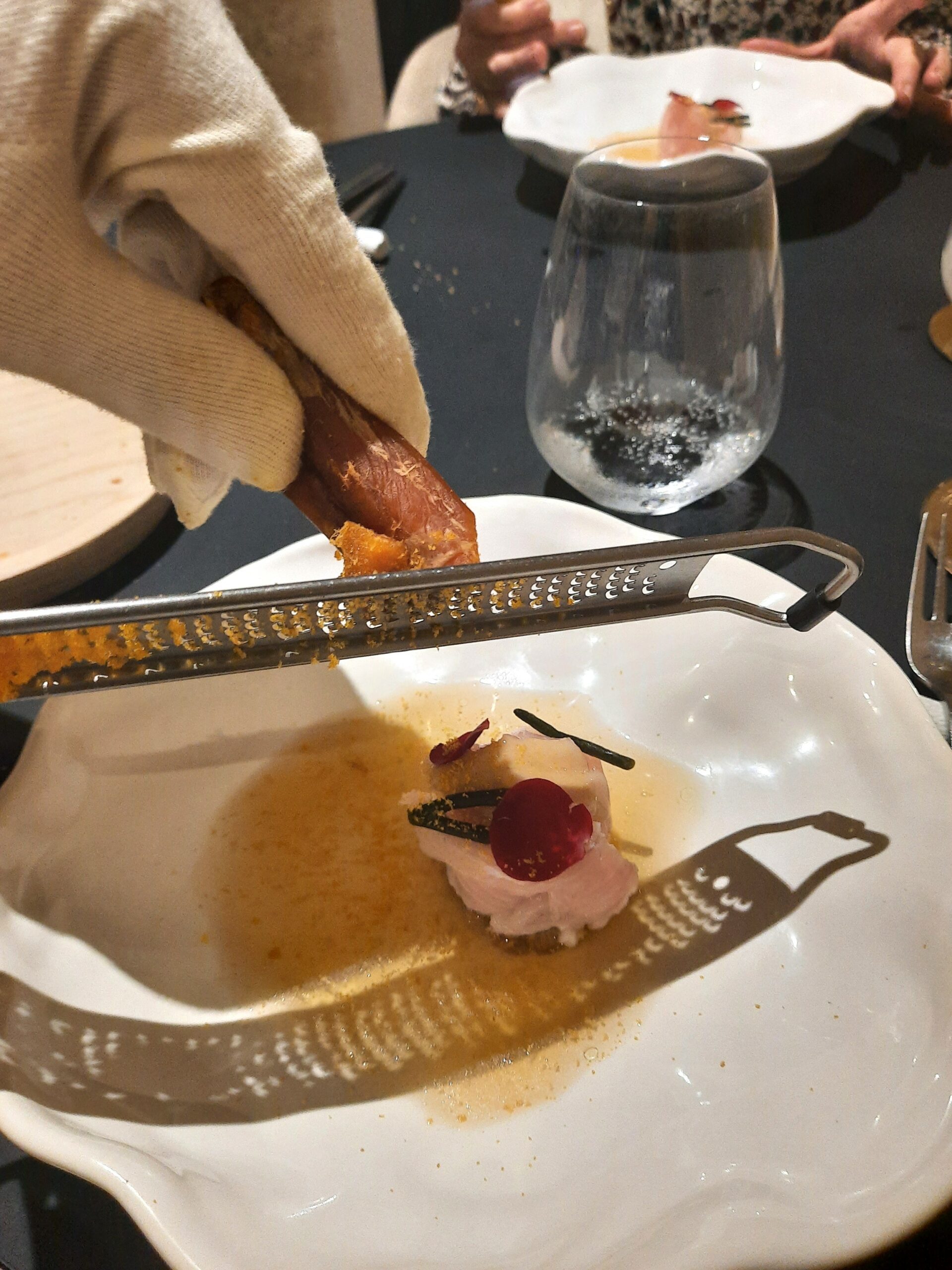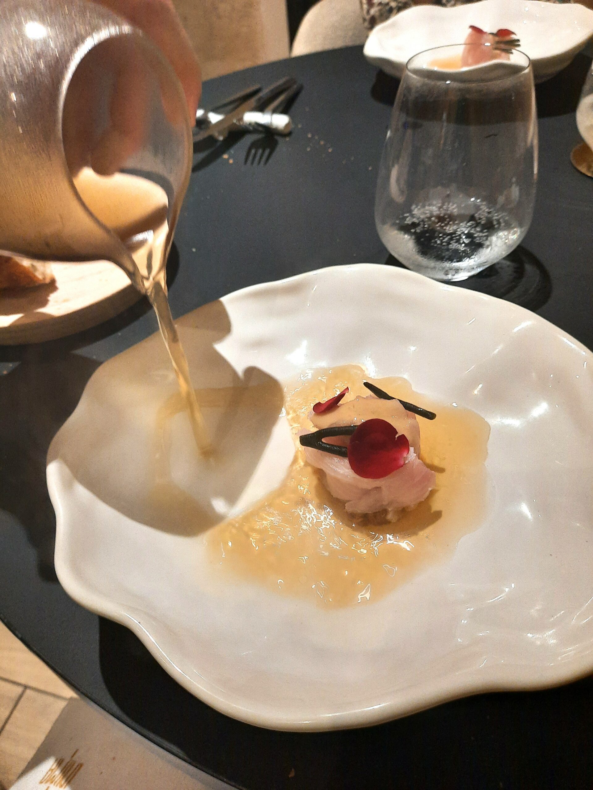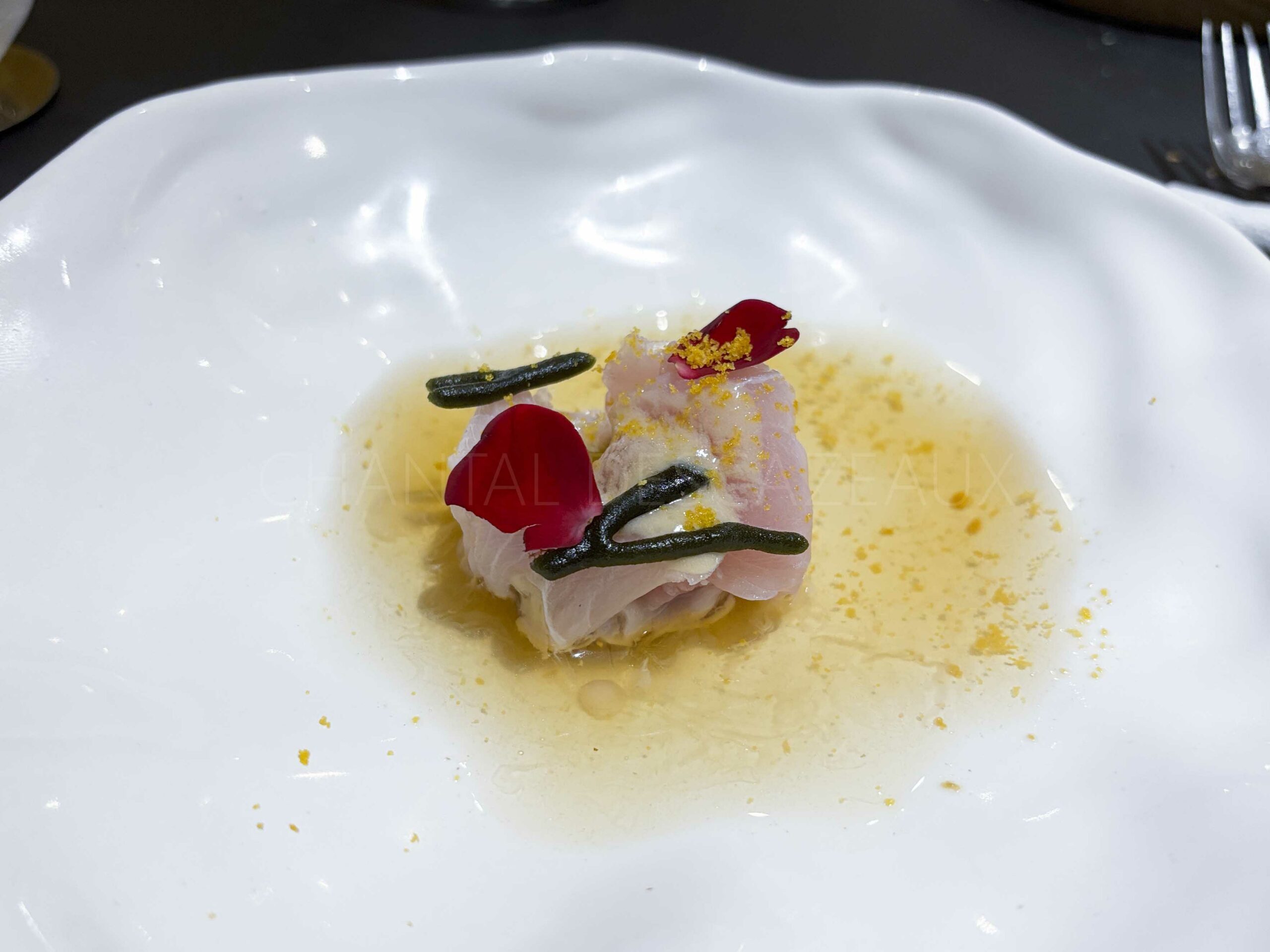 Sériole Ikejimé maturée par la Cheffe Oxana, crémeux de citronnelle, champignons crinière de lion cuite avec de la citronnelle en dessous, algues fumées, pleurotes jaunes au goût d’agrume, bouillon gingembre, citronnelle, katsobushi et une pluie pailletée de poutargue. Une assiette avec une belle intensité gustative, une finesse remarquable, une intensité saline et fumée, un dialogue entre le brut marin (ssériole, poutargue) et la complexité aromatique (bouillon thaï). Excellent.