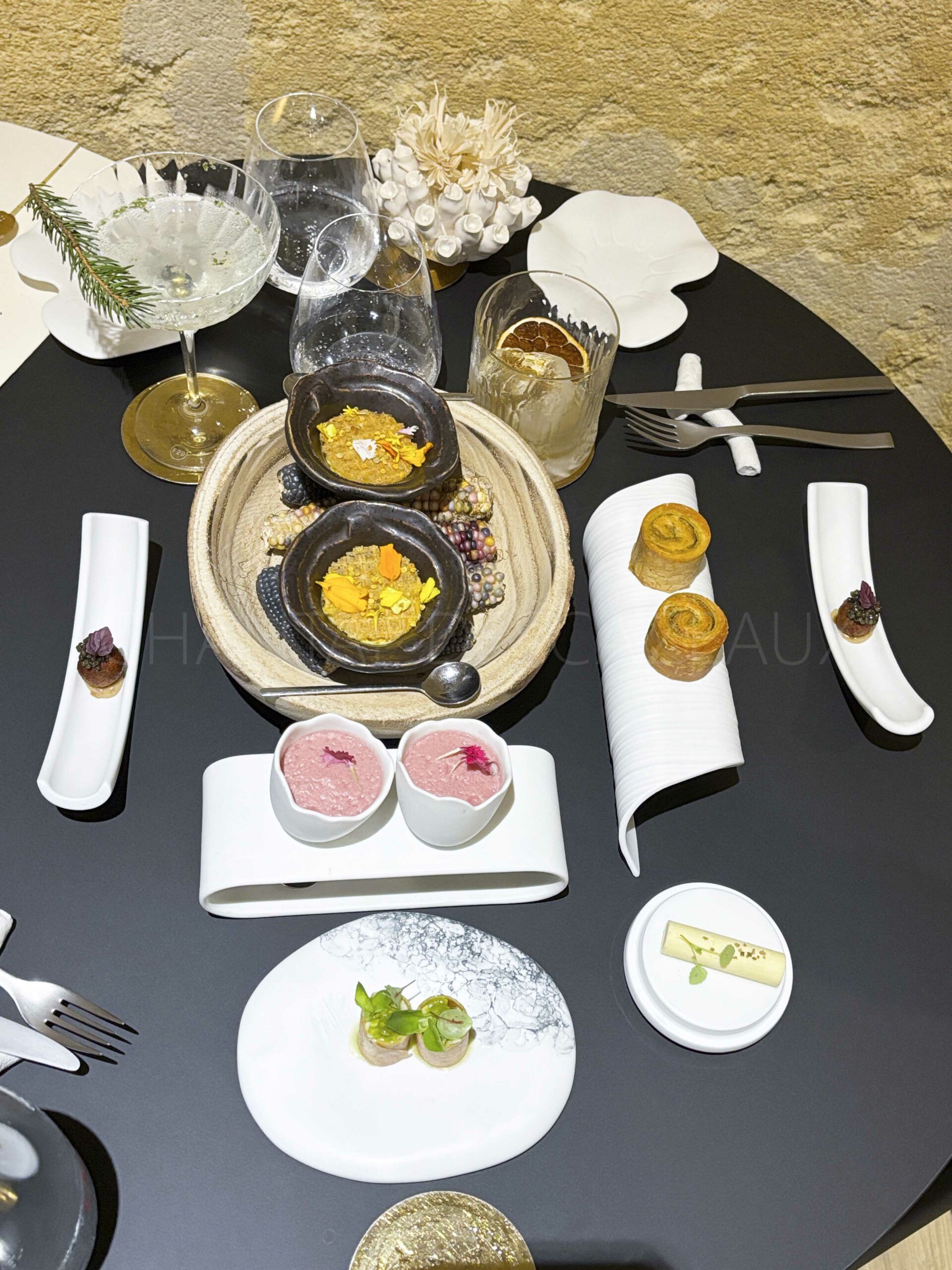 Jardin de la mer : maquereau, pois chiche de maïs et galette ; gougère au fromage parfumée à l’ail noir et caviar de la Maison Sturia ; huître fumée, calamondin et émulsion de grenade ; croustillant, mayonnaise maison, seiche, wasabi et sorbet salicoque ; feuilleté au sapin et beurre sapin légèrement fumé.