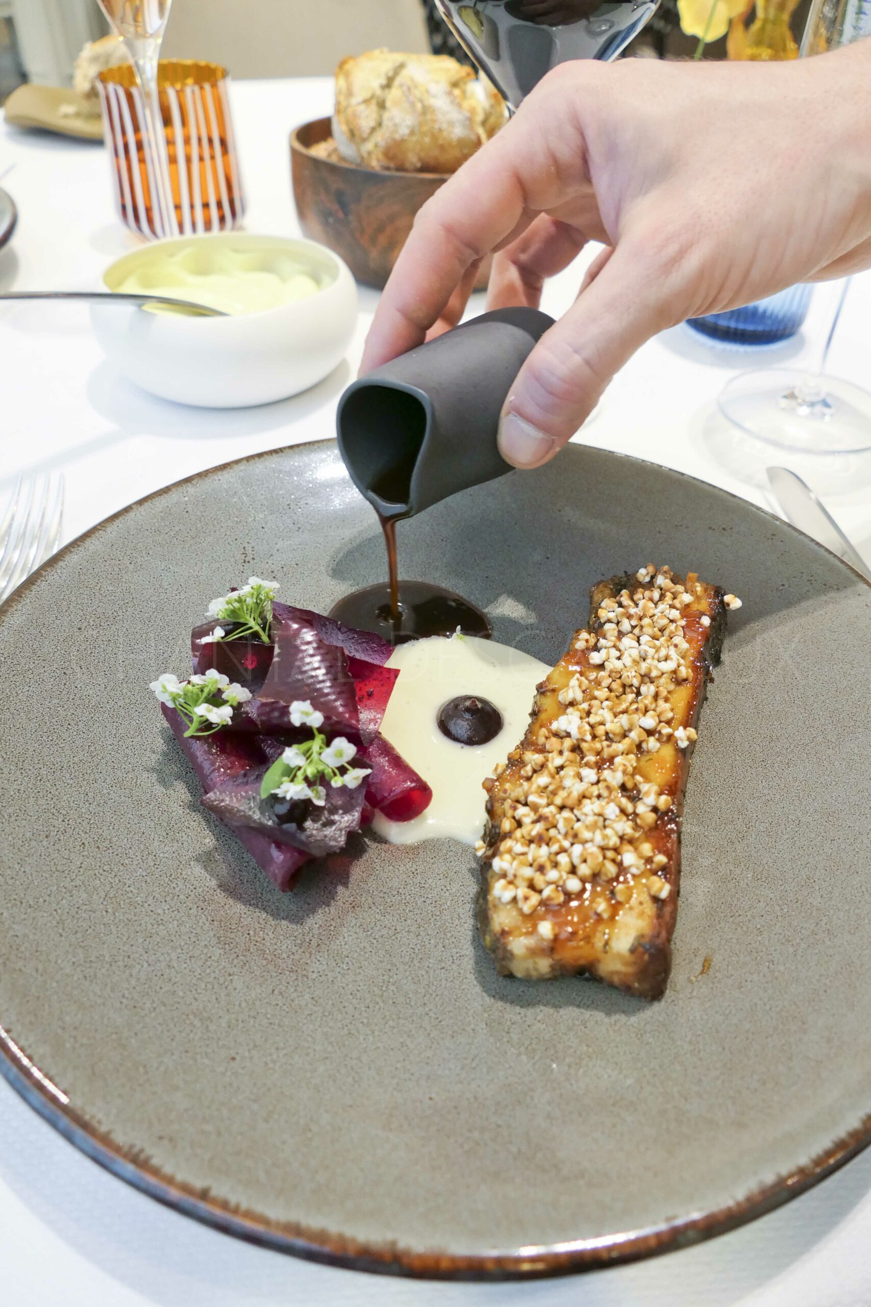 Le cochon fermier « label rouge du sud-ouest » – Cuit au bois de baie, jus au shiso et vinaigre de cerisier, feuille de perilla voilée, texture de betterave, sauce soubise