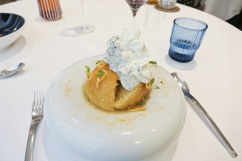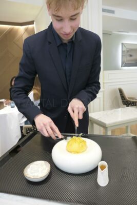 Un service au guéridon pour l’effet spectacle, un baba léger et aérien, un imbibage qui sature la pâte sans la désagréger, un dessert de tradition revisité avec une rigueur contemporaine, excellent.