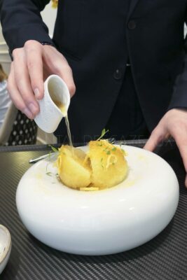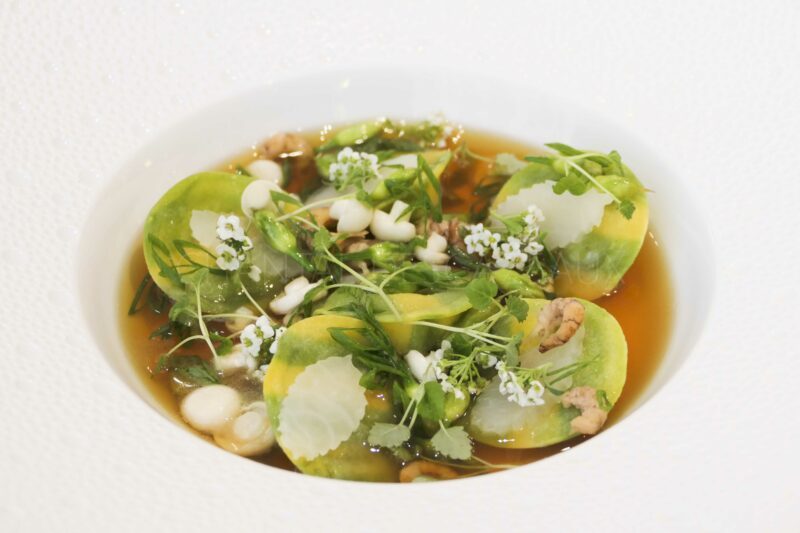 Chaque raviole est une petite œuvre d’art herborisée où le végétal apparait en transparence. Le foie gras apporte l’opulence et le gras noble, créant un contraste de texture avec la finesse de la pâte. Beaucoup de relief avec ce bouillon à la fois iodé, frais et délicat. Merveilleux d’équilibre et terriblement percutant.
